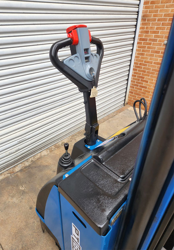 A elevação do garfo é feita através do acionamento de comando elétrico que bombeia o óleo hidráulico para dentro do conjunto e movimenta o pistão interno de elevação. O controle da tração elétrica da empilhadeira, tanto frente quanto ré, é feito por meio do acelerador. Estas duas operações são acionadas no timão de comando da empilhadeira. Com isso, nem elevação, nem translação do equipamento, necessita esforço do operador.